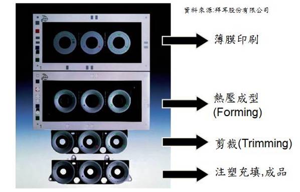 制程步驟:將薄膜送進模具內并定位,接著合模后圖樣轉印至射出產品,打開模具后薄膜剝離,產品頂出。